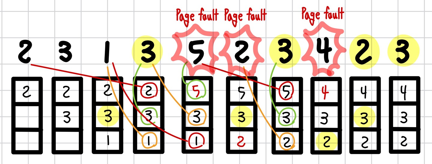 Ch.14-3 프로세스가 사용할 수 있는 프레임이 3개 있고, 페이지 참조열이 '2313523423'일 때 LRU 페이지 교체 알고리즘으로 이 페이지를 참조한다면 몇 번의 페이지 폴트가 발생하는지 풀어보기